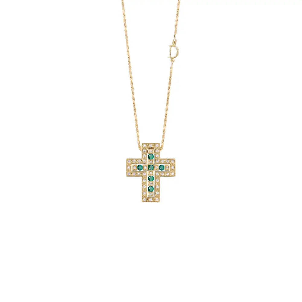 COLLANA CROCE IN ORO GIALLO CON DIAMANTI E SMERALDI